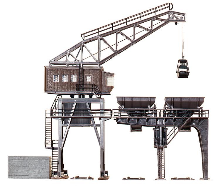Realistische kolenbunker, compleet met hoge bunker, twee kolenkorven (elk 170 mm), portaalkraan en een zakje »kolen« voor de realistische versiering.