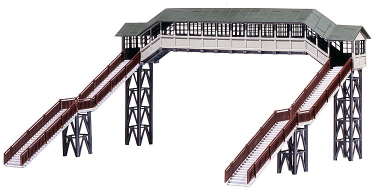 met open trapopgangen en overdekt, gesloten bordes voor voetgangers. Te bouwen in verschillende uitvoeringen. Overspant tot 4 sporen.