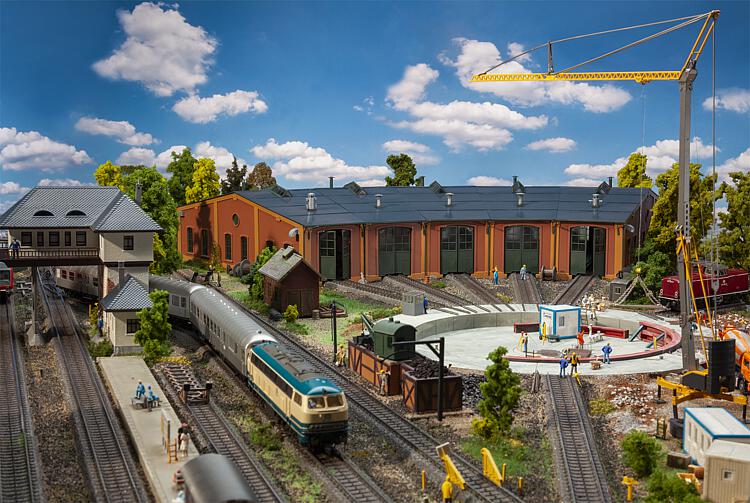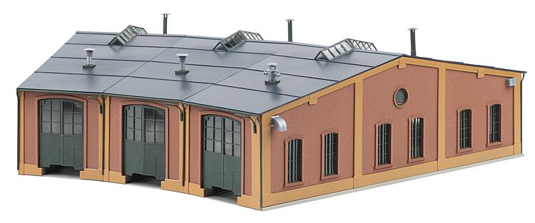 Voor het stationeren van uw locomotieven. 3-delige, uitbreidbare ringlocloods voor gebruik op een draaischijf met een uitgangshoek van 12°. De kleuren van het geraamte en metselwerk van het bakstenen gebouw steken tegen elkaar af. De zijwanden zijn elk voorzien van zeven ramen en elk loodsdeel is uitgerust met drie achterramen, een schoorsteen, een dakraam en een schoorsteenkop. Aandrijfelementen en aanstuurdraad voor het bewegen van de poorten met een servo inbegrepen (Servo, Art. 180726 apart verkrijgbaar). Plaats voor voertuigen tot 290 mm lengte over de buffers. Poorthoogte: 72 mm. Model geschikt voor alle gangbare spoorsystemen.
