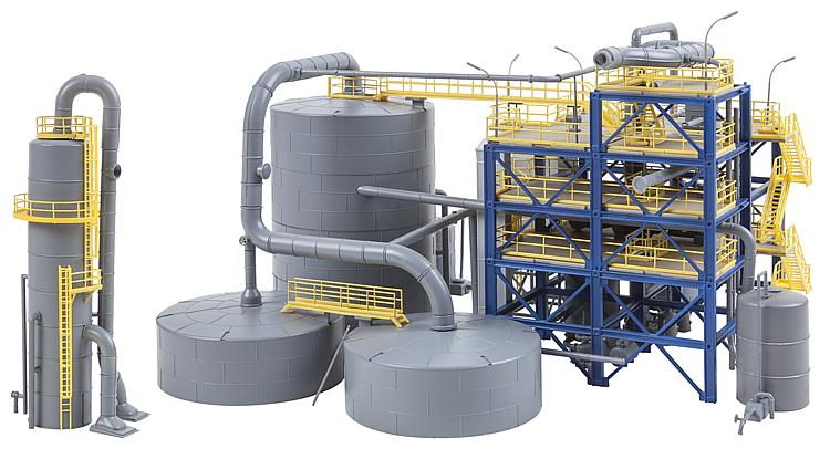 Megafabriek op mini-schaal. Productiefabriek van de chemische industrie, met grote tank en reactor, waarin het te gebruiken product wordt gemengd, zodat het vervolgens door verschillende kookpunten in serie wordt gescheiden. Verdampte vloeistoffen en gassen worden via warmtewisselaars gecondenseerd en via buizen naar tanks, die als opvangvolume dienen, geleid, waar ze worden opgeslagen. De opslag en bediening van verder noodzakelijke machines, pompen, luchtkoelers of compressoren geschiedt in het vrijstaande, meerdere etages tellende apparatensysteem, dat via trappen en ladders toegankelijk is. Het bouwset is modulair uitbreidbaar, bijv. met de »serie met buizen«, art. 130177.