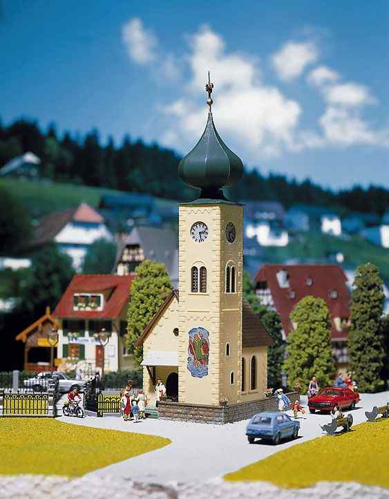 130236 Faller Dorpskerk Zij heeft een puntige toren en op het dak een ooievaarsnest Er bestaat de m..