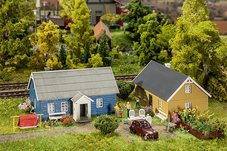 Kleurrijk leven. Set met twee houten huisjes van één verdieping, met in lengterichting aangebrachte planken en zadeldak. Een huisje is voorzien van aangebouwde ruimte tussen buitendeur en tochtdeur. Façadekleuren en -bekleding zijn gebaseerd op de vrolijke verschijning van Zweedse huisjes.