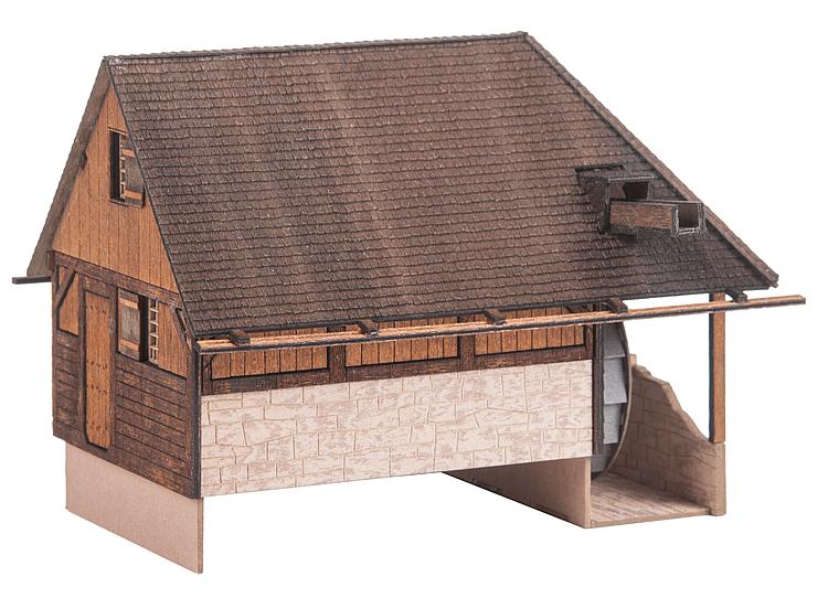 Laser-cut model van een historische graanmolen met leistenen dak naar origineel voorbeeld in het Gütenbacher »Hübschental«. De gevelzijde met het grote rad, dat door de waterkracht van de beek en via een hoge waterloop wordt aangedreven wordt beschermd door een schilddak. Naast de molensteen nodigt een bank uit tot verblijven.