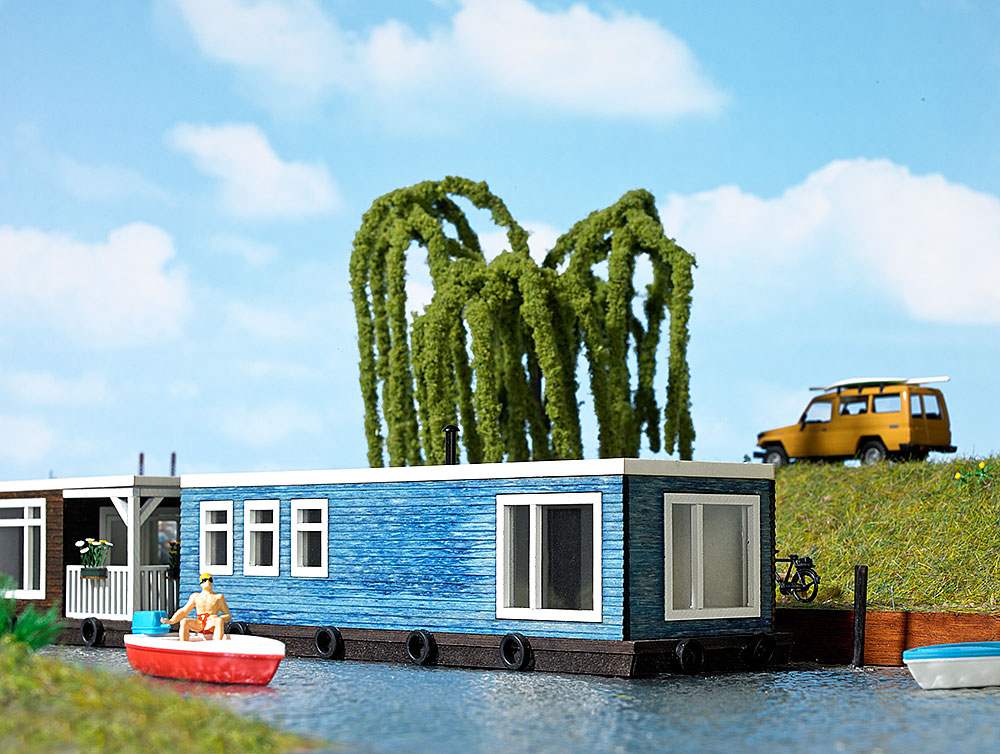 1439 Busch Woonboot lichtblauw , inclusief 2 bootjes en fietsen Echt Hout!