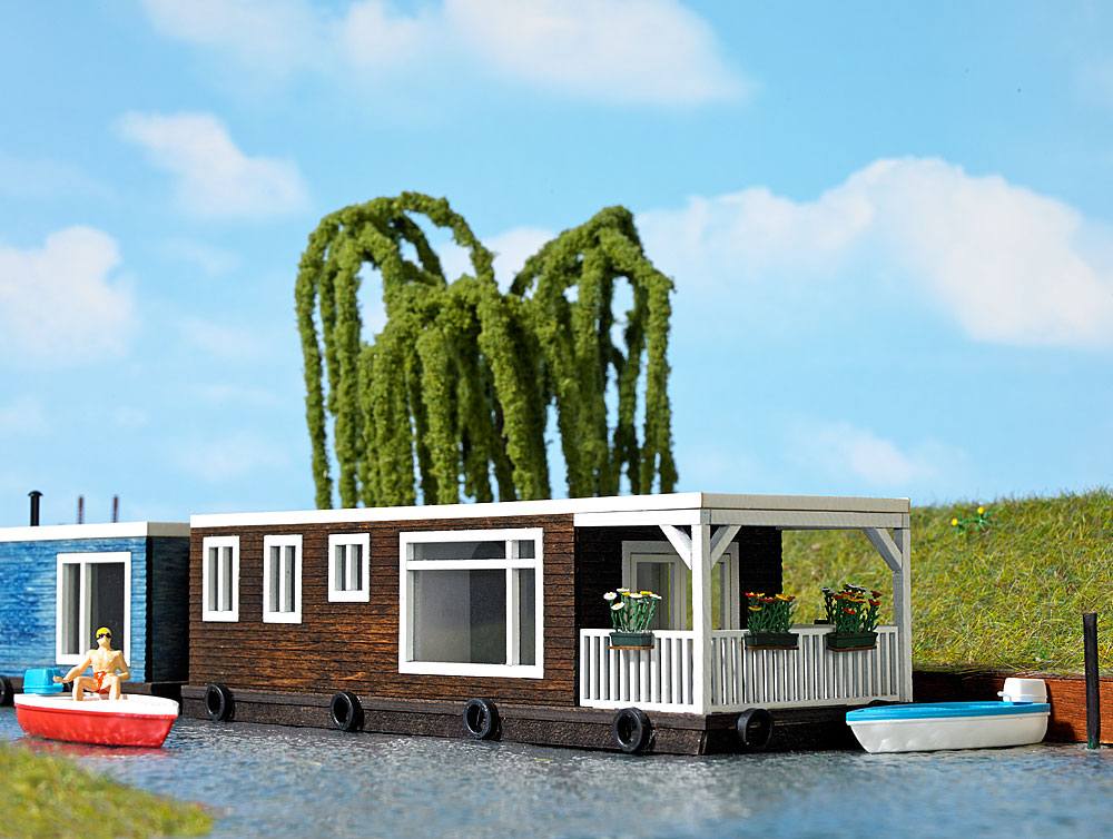 1439 Busch Woonboot lichtblauw , inclusief 2 bootjes en fietsen Echt Hout!