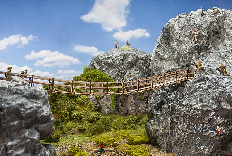 Lasercut model van een kleine hangbrug met een van houten planken voorzien brugdek en leuningen. Deze hangt boven diepere dalen of maakt de oversteek over water mogelijk. De bruglengte kan flexibel worden vormgegeven. Een staalkabel wordt in de bouwdoos meegeleverd.