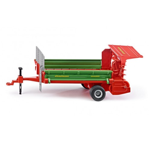 De 1-assige variant van de mestverspreider van Strautmann maakt het assortiment van landbouwaanhangers compleet met een model dat over de hele wereld bekend is. De bak met de kleppen die aan beide zijden kunnen worden geopend, is net als het chassis gemaakt van metaal. De achterklep is beweegbaar en biedt vrij zicht op de strooischijven die door middel van tandwielen met de as verbonden zijn en snelheidsafhankelijk ronddraaien. De schraapbodem-look is geaccentueerd met inkervingen. De steunpoot op de dissel is beweegbaar