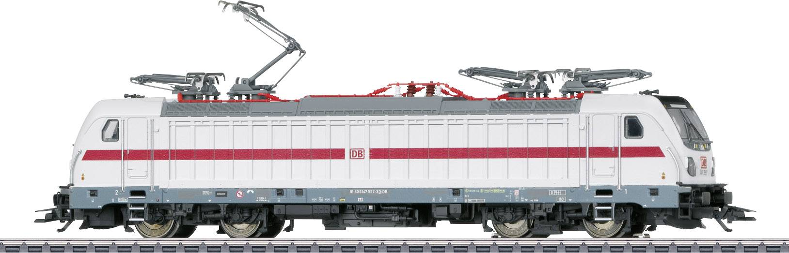Voorbeeld: Elektrische locomotief serie 147. 5 van de Deutsche Bahn AG (DB AG) voor het langeafstandsverkeer. Multifunctionele locomotief zonder flexpaneel, door Bombardier gebouwd als standaard locomotief uit de actuele TRAXX-generatie P160 AC3. Kleurstelling van het langeafstandsverkeer, lichtgrijs met verkeersrode sierstrepen in het actuele IC-design. Bedrijfsnummer: 147 557-3. Zoals in gebruik in juli 2018. Model: Elektrische locomotief in metalen uitvoering, met digitale mfx-decoder en uitgebreide geluidsfuncties. Speciale motor, centraal ingebouwd. 4 via cardan aangedreven assen. Antislipbanden. Met de rijrichting wisselend driepuntsfrontsein en 2 rode sluitseinen, in conventioneel bedrijf, digitaal schakelbaar. Frontseinen aan loczijde 2 en 1 elk afzonderlijk digitaal uitschakelbaar. Wanneer het frontsein aan beide zijden van de loc is uitgeschakeld, is aan weerszijden de dubbele A-verlichting ingeschakeld. Verlichting met warmwitte en rode ledlampjes. 4 mechanisch werkende dakstroomafnemers. Voorbeeldgetrouwe imitatie van de zijvlakken. Lengte over de buffers ca. 21,7 cm.