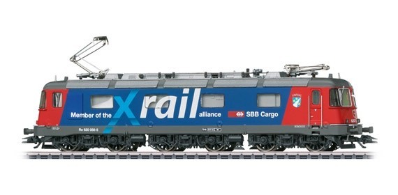 Voorbeeld: Zware elektrische locomotief serie Re 6/6 als Re 620 van de Zwitserse spoorwegen (SBB). Uitvoering in vuurrode/ultramarijnblauwe basiskleurstelling, met opschrift aan de zijkant "Member of the Xrail alliance" van de nv Xrail, B-Brussel. Hoekige frontlampen, UIC-stopcontacten, schuine handgrepen aan kopse zijde, aan een loczijde met toegangsdeur voor airconditioning. Bedrijfsnummer van de locomotief 620 088-5, met locomotiefwapenschild "LINTHAL". Zoals in gebruik rond 2014.