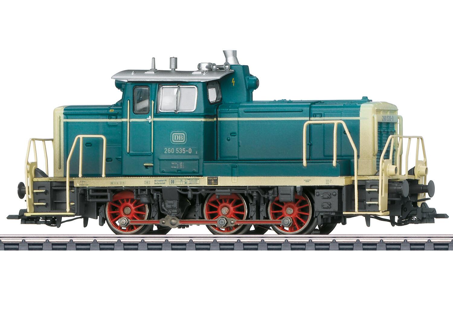 Voorbeeld: Dieselrangeerlocomotief serie 260 van de Deutsche Bundesbahn (DB). Basiskleurstelling oceaanblauw/ivoor. Dieselhydraulische aandrijving met blinde as. Bedrijfsnummer: 260 535-0. Zoals in gebruik rond 1978.