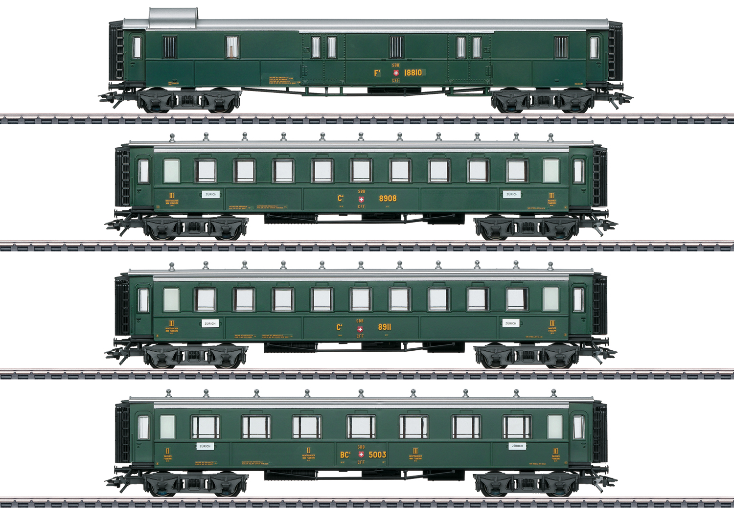 Voorbeeld: Ouder type van de Schweizerische Bundesbahnen (SBB/CFF/FFS) in dennengroene basiskleurstelling. 1 bagagewagen F4. 2 personenrijtuigen C4, 3e klasse. 1 personenrijtuig BC4, 2e en 3e klasse. Oorspronkelijke uitvoering.