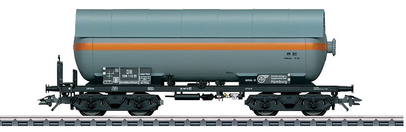 Voorbeeld: Drukgasketelwagen, gebruikt bij de Deutsche Bundesbahn (DB), privéwagen van de VTG Vereinigte Tanklager und Transportmittel GmbH, Hamburg. Model: Gedetailleerd onderstel met doorbroken frame. Langsdragers als U-profiel met kabelogen. Draaistellen conform type Minden-Dorstfeld. Ketel met zonwerend dak. Gemonteerd remplatform. Lengte over de buffers 14,6 cm. Gelijkstroomwielstel E700580. Trix-Express-wiekstel wagen E33357811.