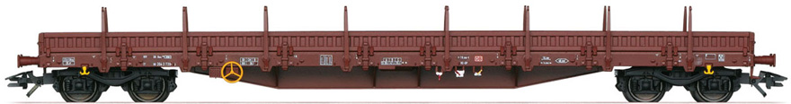 Voorbeeld: Vierassige lageboordwagen type Res 676 van de Deutsche Bahn AG (DB AG). Europese standaarduitvoering met een lengte van 19,90 m. Uitvoering met stalen zijwangen, rongen en hoekige buffers. Zoals in gebruik tijdens tijdperk V.