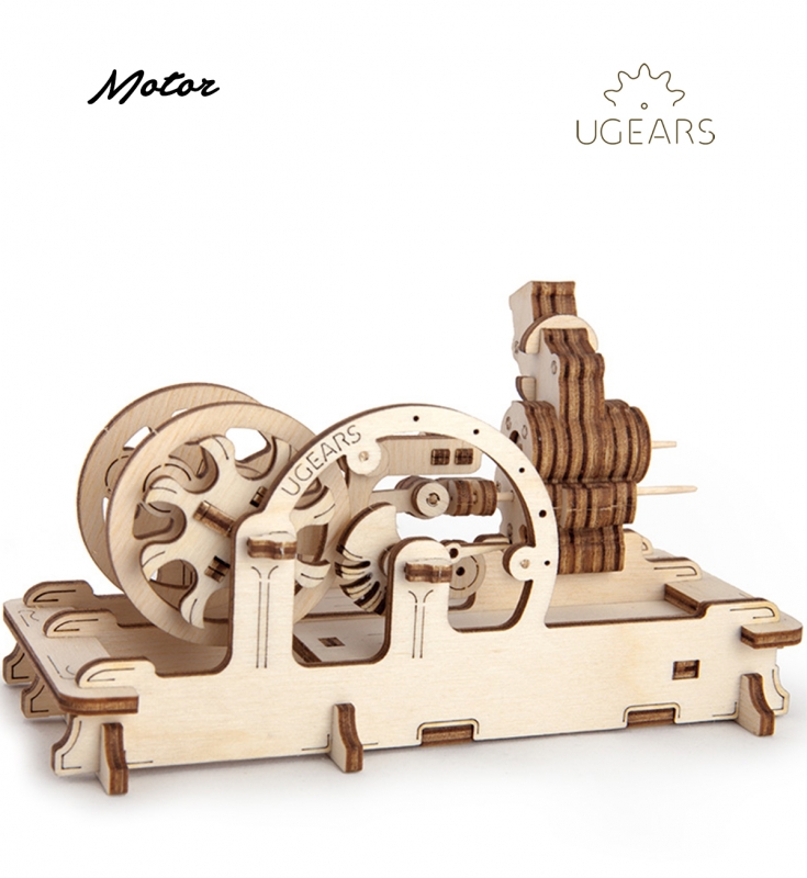De luchtmotor van UGEARS is een kleine, maar exacte nabootsing van de stoommachine. Je hoeft alleen maar te blazen in een speciale bus of - andersom -hier een gewone ballon op plaatsen en de luchtmotor zal gaan werken. Dit model is ongebruikelijk omdat het geheel gemaakt is van houten materialen. Het mechanisme heeft een toerenteller en twee onderdelendoosjes.