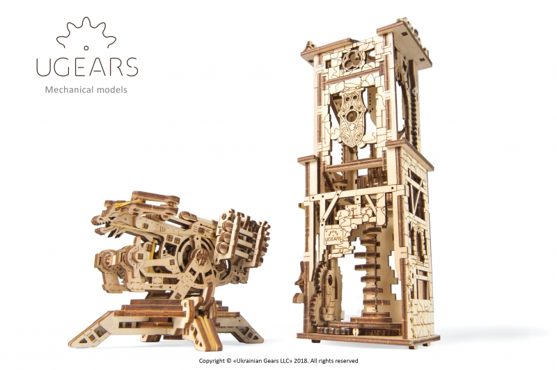 Dit majesueuze wapen is gemaakt om verdedigings-bolwerken af te breken en is al sinds de oudheid in gebruik. Het tweedelige model van UGears verwijst echter naar de middeleeuwse periode. Dit is duidelijk te zien aan het ontwerp, vooral de details van de toren. Versierd met delicate ornamenten verbergt een klassieke kasteeltoren met klimop en een heraldische griffioen of draak op een wapenschild. Enkele interessante constructieve kenmerken: het is een UGears-model, wat betekent dat het onmogelijk een statisch stuk hout kan zijn. Het tandwiel aan de zijkant van de toren zet een mechanisme in beweging dat het tweede niveau omhoog tilt en zo de wenteltrap en de binnenstructuur onthult. De toren is volledig uitgestrekt wanneer je het hele schild kunt zien met een draak die parallel staat aan de muur van de toren. Richt je ballista op het schild en het tweede niveau stort in, gedropt door het machtige wapen.