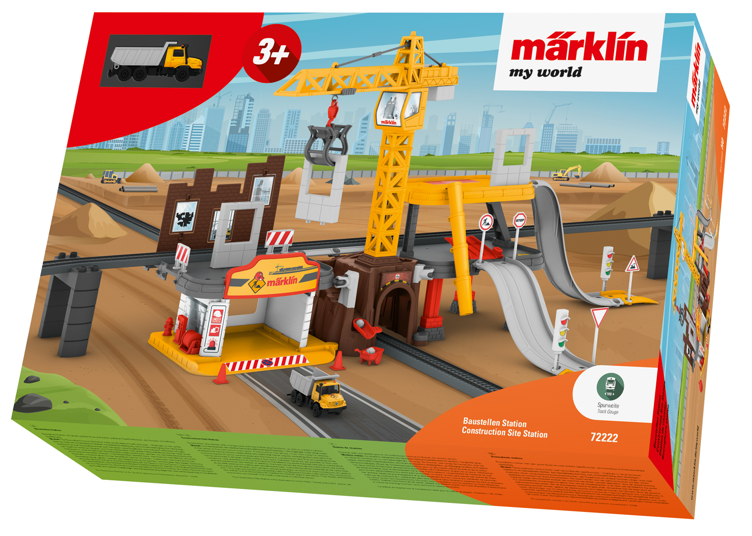 De bouwplaats station biedt veel verschillende speelfuncties – highlight is de grote kraan midden in de bouwplaats station. Een bouwplaatsvoertuig, een snelstarthelling voor voertuigen, draaibare ruiten, verplaatsbare bouwplaatswanden, een kogelbaan en andere functies zorgen voor veel speelplezier rondom het thema bouwplaats. De twee helften van het gebouw kunnen via een scharnierpunt onder verschillende hoeken ten opzichte van elkaar worden geplaatst. Voor de railaansluiting zijn verschillende uitvoeringen mogelijk. Een van de mogelijkheden is de rails van de Märklin my world viaductspoorweg samen met de bouwplaats station te gebruiken. Bovendien kan de baan door de bouwplaatstunnel worden geleid, de ideale positie voor laden en lossen van de trein. Door de verschillende uitvoeringen van de railaansluiting op niveau 0 en niveau 1 kan het gebouw met verschillende en meerdere spoorbanen tegelijk worden gecombineerd. De wegaansluitingen zijn compatibel met het stratensysteem van Majorette Creatix. Bouwplaats station als stabiele bouwdoos, geschikt voor kinderen vanaf 3 jaar. Stickerblad en opbouwhandleiding worden meegeleverd. Levering in losse onderdelen.