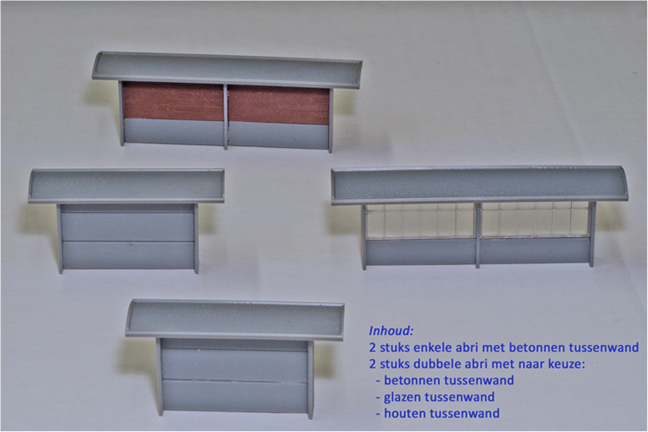 De bouwsets bevatten in totaal vier abri’s. Twee enkelvoudige abri’s met betonnen tussenwand en twee dubbele abri’s met naar keuze een tussenwand van beton, hout of glas.
