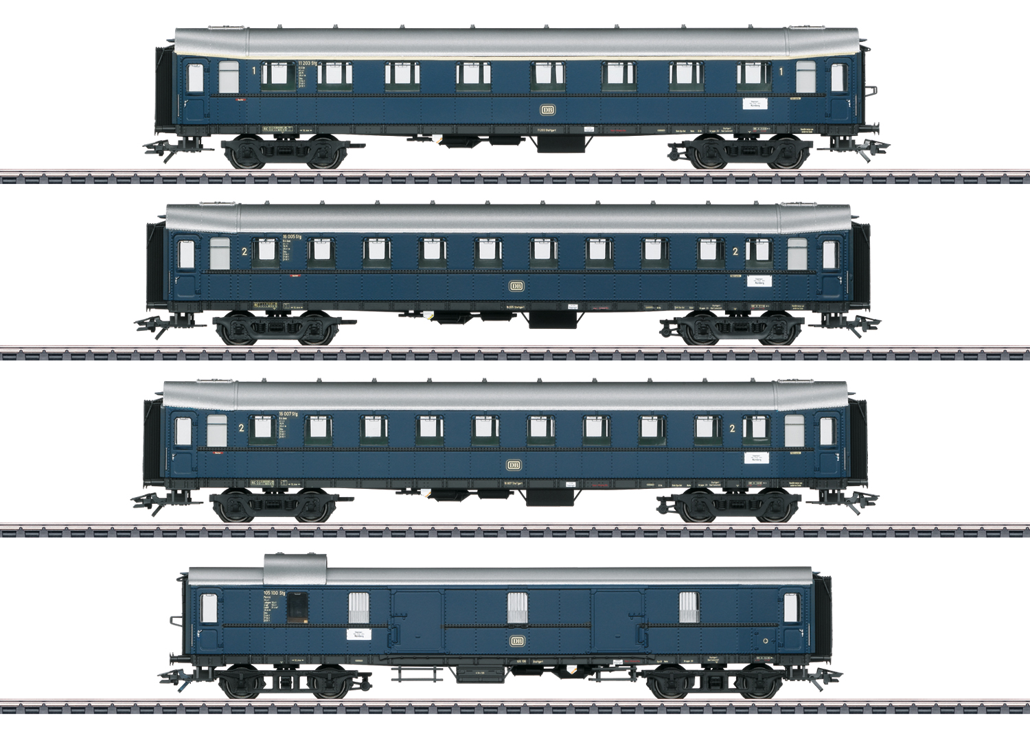 verschillende sneltreinrijtuigen type "Hecht" in fictieve staalblauwe