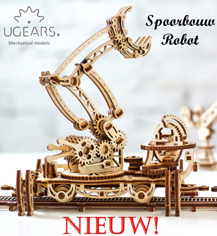 De Spoorbouw Robot is een compleet nieuw UGears model uit de Mechanische Stad serie. De set bevat de Robot, twee spoordelen, de schuur in aanbouw, twee postkratten met deuren, een kraan, een vrachtwagen en vijf figuren. Hij hoort in de rivierhavens van de Mechanische Stad, dichtbij de Mechanische Wonderen Fabriek, of - zoals de plaatselijke inwoners zeggen - de Robot Fabriek.