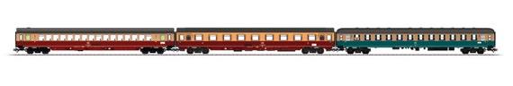 Voorbeeld: 3 verschillende IC-sneltreinrijtuigen van verschillende typen van de Deutsche Bundesbahen (DB). 1 grootruimrijtuig Apmz 121 1e klassen, 1 coupèrijtuig Avmz 207 1e klasse en 1 coupérijtuig Bm 235 2, 2e klasse. Kleurstelling purperrood/ivoor en oceaanblauw/ivoor. Met neerklapbare treden. ronde en schuine daken en met het voorbeeld overeenkomende draaistellen passen bij coupè- en grootruimrijtuigen. Voor het thema Intercity 690 "Hohenstaufen" voor de treinenloop München - Stuttgart - Heidelberg - Mannheim - Frankfurt/M - Hannover - Hamburg/Altona. Bedrijfstoestand 1983.
