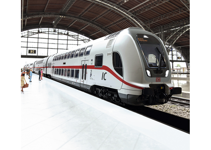 Voorbeeld: IC2 dubbeldeks stuurstandrijtuig DBpbzfa 668.2, 2e klasse van de Deutsche Bahn AG (DB AG) voor langeafstandsverkeer. Lichtgrijze kleurstelling cvoor langeafstandsverkeer met verkeersrode sierstrepen, in het huidige IC-design. Traject: IC 2035 van Norddeich naar Leipzig Hbf. Wagenindelingsnummer 1. Zoals in gebruik rond 2016.