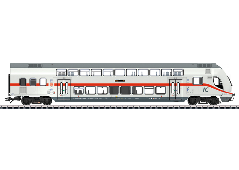 Model: Kleinst berijdbare boogradius 360 mm. Met diepe instap tussen de draaistellen. Standaard met ingebouwde ledbinnenverlichting op beide niveaus en stroomgeleidende, scheidbare kortkoppeling aan de zijkant van het rijtuig zonder machinistencabine. Verlichte weergave van de bestemming aan de kopzijde boven de machinistencabine, apart digitaal schakelbaar. Verlichte bestemmingsweergave aan de zijkanten. Binnenverlichting en weergave van de bestemming aan de zijkanten kunnen samen met de andere dubbeldeks tussenwagens via een decoder in het stuurstandrijtuig digitaal worden in- en uitgeschakeld. Hiertoe is een welbepaalde rijtuigenvolgorde bepaald. Met de rijrichting wisselend driepuntsfrontsein en 2 rode sluitseinen, apart digitaal schakelbaar. Grootlicht extra apart digitaal schakelbaar. Omschakeling van de lichten, binnenverlichting en weergave van de bestemming aan de zijkant in conventioneel bedrijf. Door een afscherming aan de zijde van de machinistencabine weg te nemen, kan een normale koppeling worden ingezet, om aan een locomotief aan te koppelen. Aan de kopse zijde rood doorzichtige sluitseininzetten aan het uiteinde van het rijtuig zonder machinistencabine. Voorbeeldgetrouwe draaistellen van het type Görlitz.