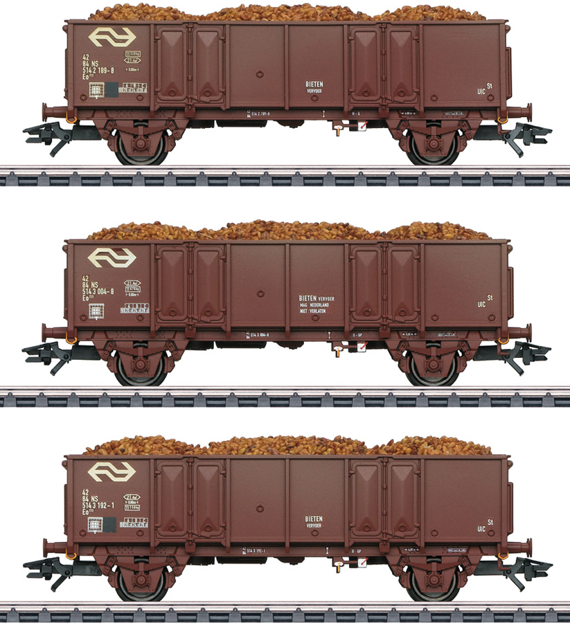 Model: Wagens beladen met een imitatie van suikerbieten als lading-inzetstukken. De wagens zijn voorzien van lichte gebruikssporen. Alle wagens hebben verschillende bedrijfsnummers en zijn afzonderlijk verpakt, met een extra omverpakking. Totale lengte over de buffers 32 cm. Gelijkstroomwielstel per wagen E700580.