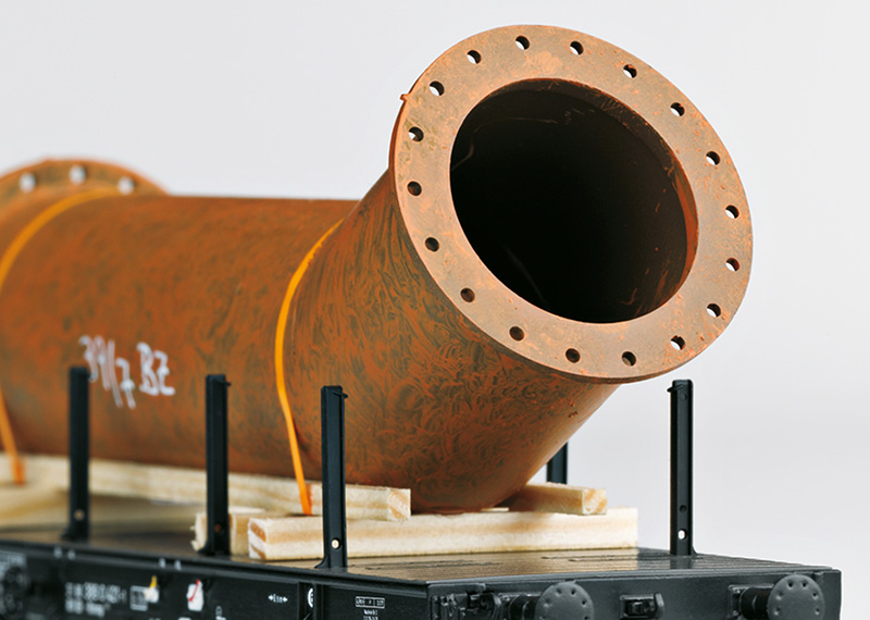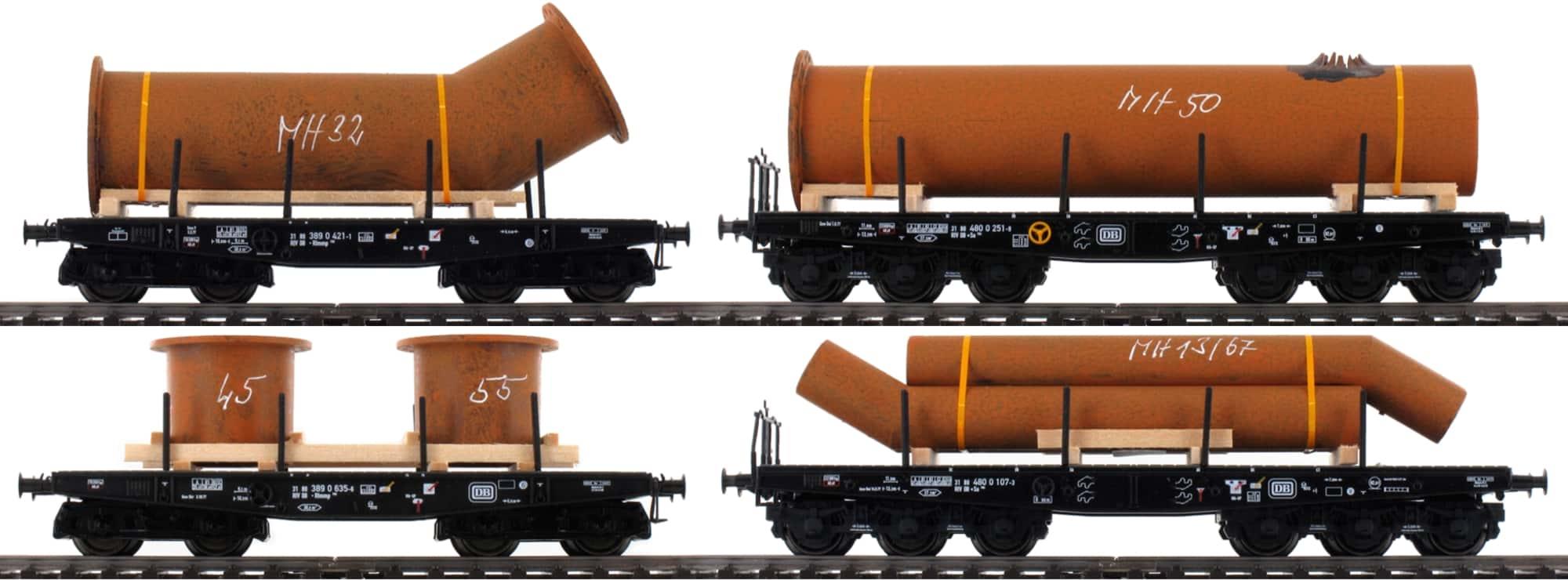Model: Opbouw van de platte wagens uit metaal. Platte wagens telkens eenmaal met gebarsten buis, afgeronde, 3-delige buizenset, knikflenspijpen twee flenspijpsteunen beladen. Afbeelding van de lading in roestig ogende uitvoering. Meerdere bedrijfsnummers. Monteerbare rongen telkens meegeleverd. Alle wagens afzonderlijk verpakt. Lengte over de buffer van de 6-assige wagen 15,2 cm. Lengte over de buffer van de 4-assige wagen 12,4 cm. Gelijkstroomwielstel per platte wagen E700580.