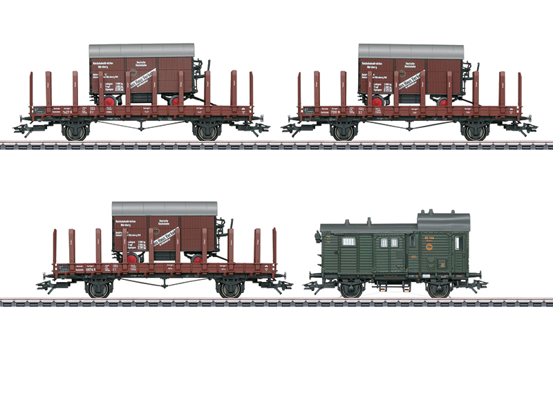 Voorbeeld: Vier verschillende types goederenwagens van de Deutsche Reichsbahn-Gesellschaft (DRG). Drie tweeassige open goederenwagens met houten rongen R Stuttgart zonder handrem. Grote container met wegonderstel van de Deutsche Reichsbahn-Gesellschaft (DRG). Goederentrein-bagagewagen Pwg Pr 14. Zoals in gebruik rond 1929.