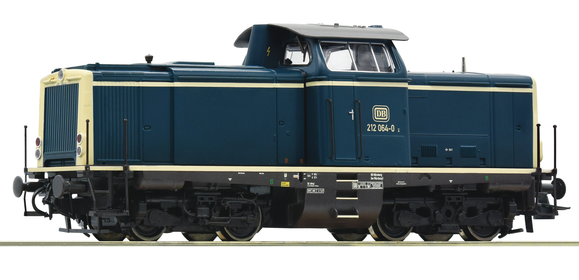 Diesellokomotive Baureihe 212 in ozeanblau/beiger Lackierung der Deutschen Bundesbahn.
