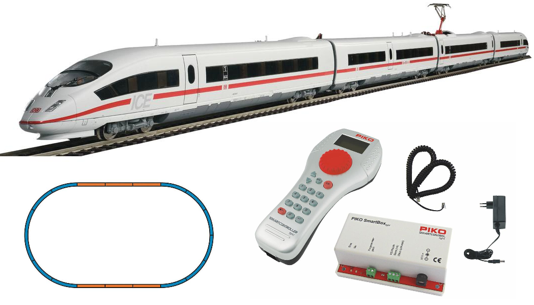 Mit dem neuen digitalen PIKO SmartControllight Handregler kann der ICE 3 rasant durch die Kurven des großen Gleisovals gesteuert wer-den und vermittelt hierbei hohen Spielspaß. Der Triebzug ist mit einem PIKO Decoder ausgerüstet und stellt den idealen Einstieg in die digitale Welt des Hochgeschwindigkeitsverkehrs im Modell dar.
