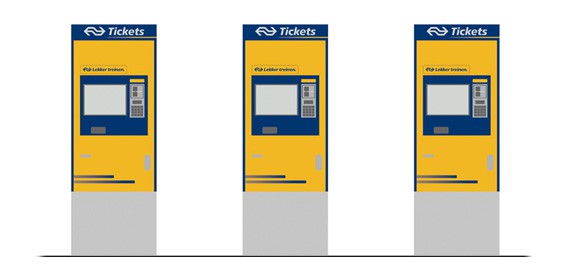 Een set van 3 Nederlandse Ticketautomaten van de NS, zoals deze op veel stations staan.