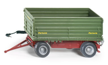 Elektronisch gestuurde tweezijden-kipaanhangwagen met draaischamel en dissel. De aanhangwagen wordt met een datakabel met de tractor verbonden. De bak van de aanhangwagen is elektronisch naar achter kipbaar. Hiervoor kan het reeds voorhanden afstandsbesturingsmoduul worden gebruikt. In het achterbereik van de aanhangwagen zorgen rode en oranje LED's voorachterlicht en knipperlicht. Op grond van de eigen stroomverzorging kan de aanhangwagen ook zonder de Control-tractor resp. het afstandsbesturingsmoduul worden gebruikt. Desbetreffende schakelaars zijn aan het model voorgezien, zodat kip- en lichtfunctie kunnen worden aangestuurd.