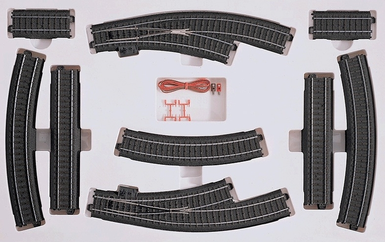 Inhoud: 3 rechte rails 24188, 5 rechte rails 24172, 2 gebogen rails 24224, 1 wissel 24611, 1 ..