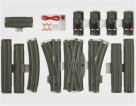 Inhoud: 3 rechte rails 24188, 5 rechte rails 24172, 2 gebogen rails 24224, 1 wissel 24611, 1 ..
