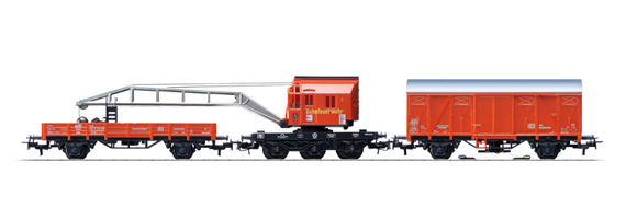 Model: kraanwagen met draaibare opbouw, bewegende uitligger en handwiel voor de kraandraad. Kraanbeschermingswagen met uitleggersteunen. Apparaatwagen met ingebouwde digital-decoder mfx en stroomtoevoer voor serieel schakelbare geluidsfuncties. Alle wagens met Relex-koppelingen. Totale lengte over de buffers 32,5 cm.