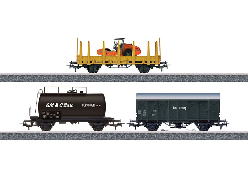 Rongenwagen met vaste rongen, ketelwagen met remplatform en overdekte goederenwagen met ingebouwde digitale mfx-decoder en stroomtoevoer voor serieel schakelbare geluidsfuncties. Alle wagens met Relex-koppelingen. Totale lengte over de buffers 34,5 cm.