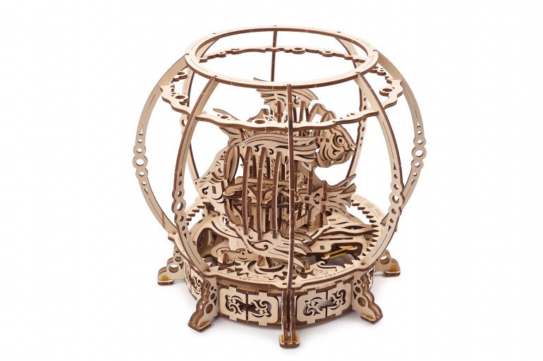 Het Mechanische Aquarium van Ugears is een ingenieuze zoutwatervissenkom, met twee tropische vissen die elkaar achtervolgen rond een bos van algenbladeren, waarbinnen zich een zeepaardje verbergt! De schoonheid en verscheidenheid van het houden van zoutwatervissen maakt het één van 's werelds meest populaire hobby's. Niet alleen is deze doe-het-zelf-aquariummodelkit, met zijn originele thema en ontwerp, een mooie aanvulling op de Ugears-catalogus, maar het heeft ook een unieke mechanische aandrijving. De vissen en algen roteren gelijktijdig en parallel, met verschillende snelheden, in verschillende richtingen en simuleren de vloeiende golvende ritmes van het onderwaterleven van planten en dieren. De elegante vissen zien eruit alsof ze echt zwemmen terwijl ze hun kop en staart heen en weer bewegen. Het mechanische aquariummodel is uniek omdat, terwijl veel ugears-modellen worden aangedreven door rubberen bandmotoren, het nu wordt aangedreven door een veer voor een langere werking en een langere levensduur. Bij Ugears zijn we trots op onze innovatie en het luisteren naar onze trouwe klanten, van wie velen hebben gevraagd naar modellen met veermechanisme. We zijn er trots op u dit aquarium met zomer-actie aan te bieden - een primeur in onze groeiende catalogus van Ugears-modellen! Om het model in beweging te brengen, draait u de knop onder het aquarium met ongeveer 25 halve slagen. Daarna draait u de schakelaar van "STOP" naar de "SWIM"-modus en u ziet hoe het mechanisch aquarium tot leven komt! Het mechanisme bevat een interne slinger om de beweging te regelen en soepel te laten verlopen. We hebben dit model ontworpen met als doel de operationele eenvoud voor gebruikers: één schakelaar, twee standen: aan en uit. Je kunt het model op ieder moment stoppen of gewoon laten gaan en ongeveer 40 seconden genieten van de bewegingen van de vissen en bladeren. Bij Ugears streven we naar prachtig design met verrassende mechanische actie, om onze klanten te charmeren en te verrassen. We denken dat u het ermee eens zult zijn dat we dat hebben bereikt met dit prachtige Mechanisch Aquarium. Met Ugears is er altijd dat extra vleugje eigenzinnigheid, belichaamd in dit model door het verborgen zeepaardje in het midden. Een deel van onze kernmissie is om mensen samen te brengen, vooral van generatie op generatie, terwijl ze bouwen en spelen met onze unieke mechanische wonderen. Maak van het Mechanisch Aquarium uw volgende familieproject!